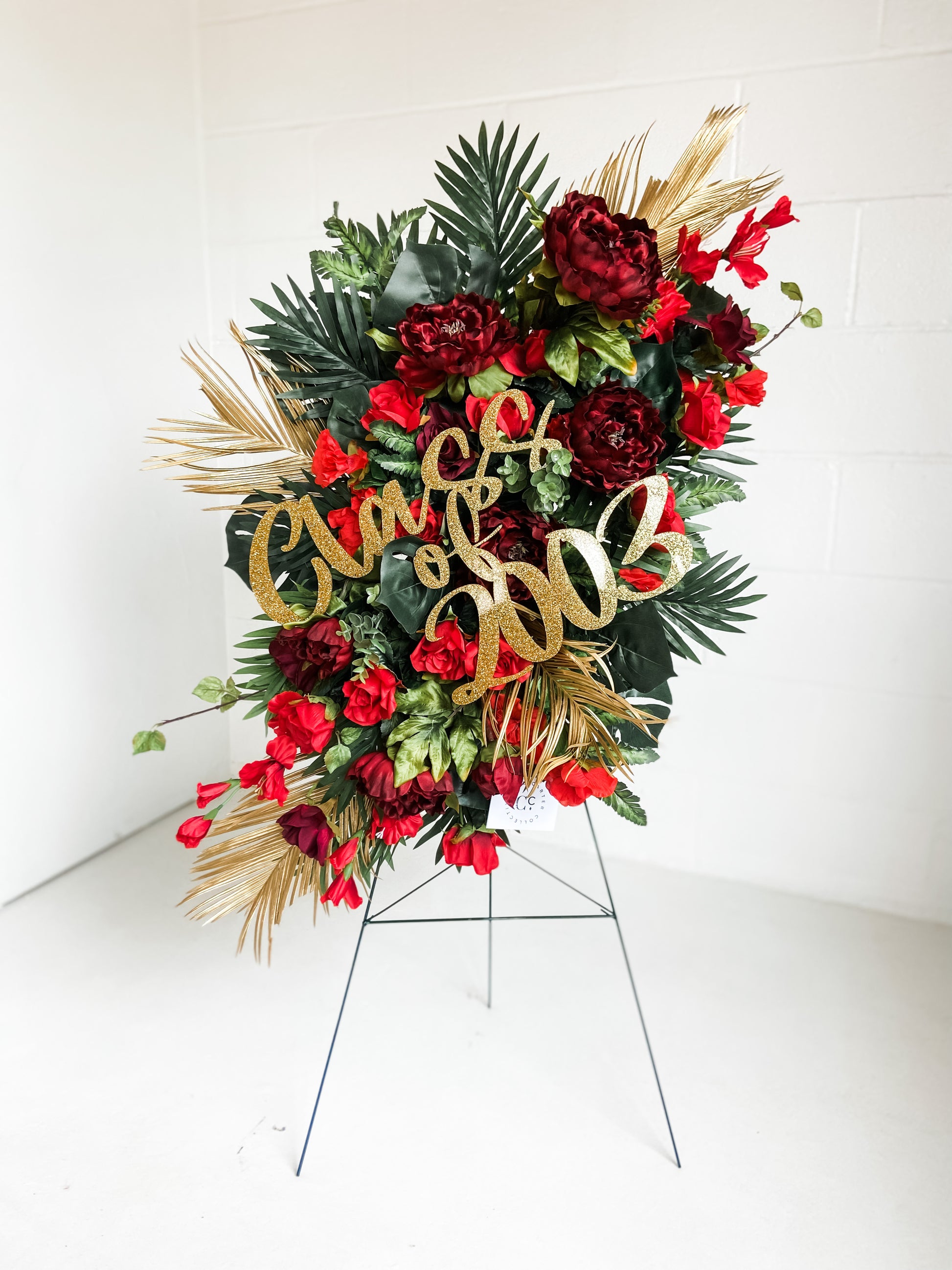 This unique way to customized a product will add a wow factor to any arrangement. Choose from Natural Wood or Acrylic. This will be an add on item to any spray or wreath.
