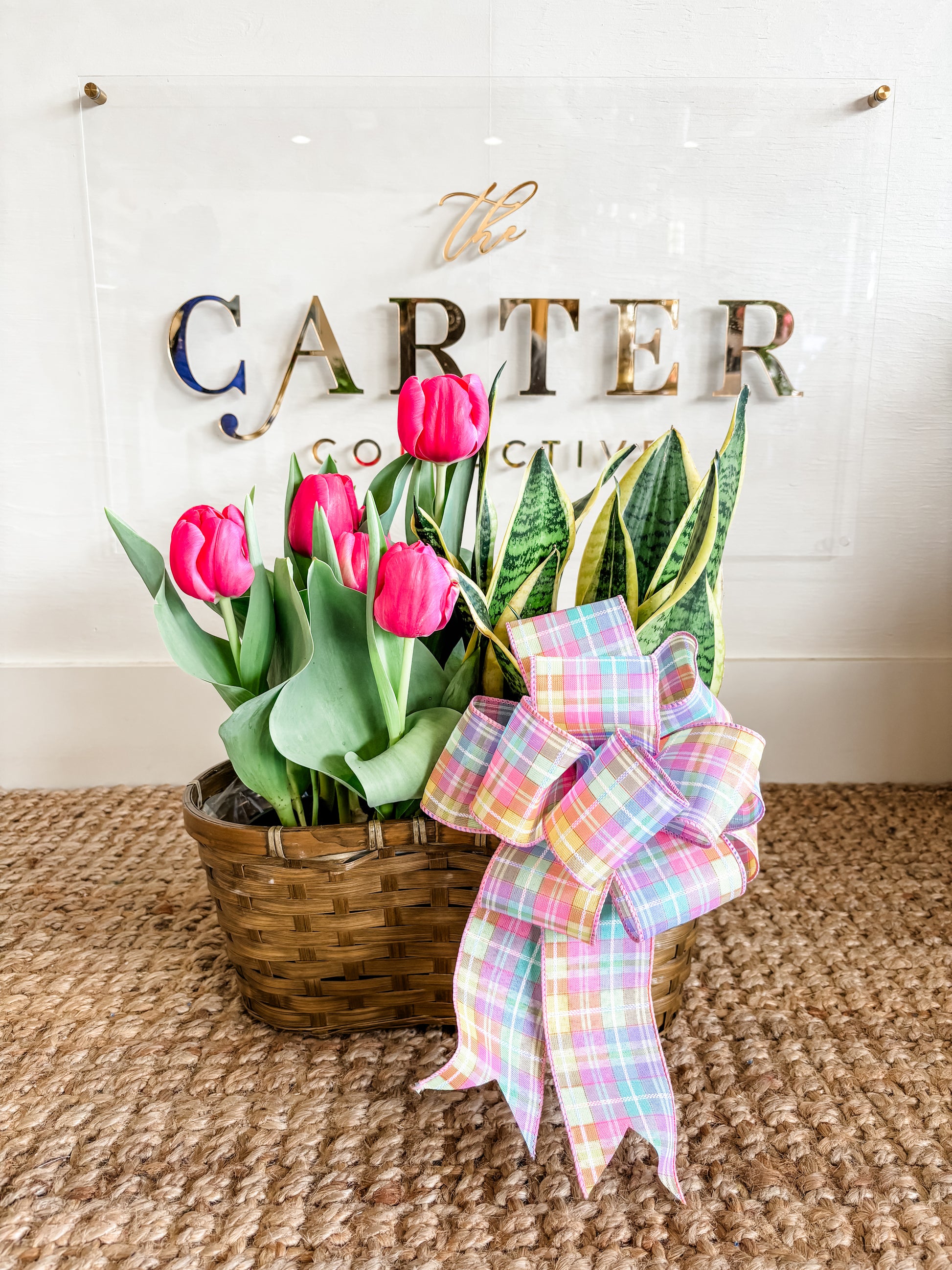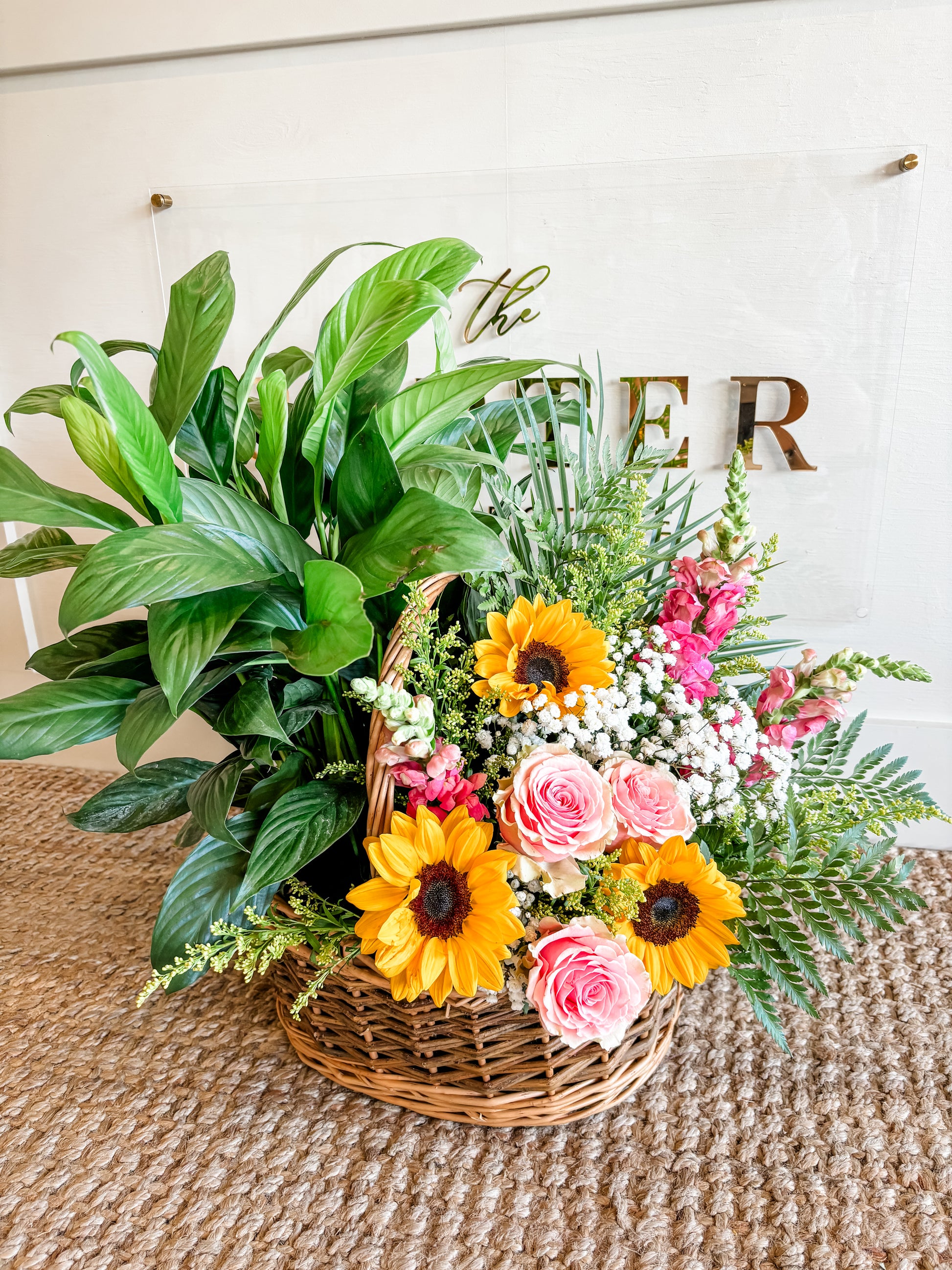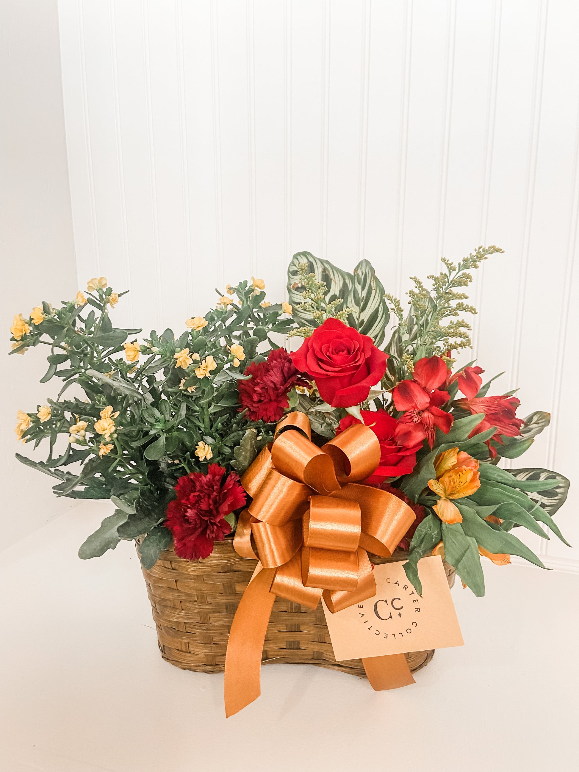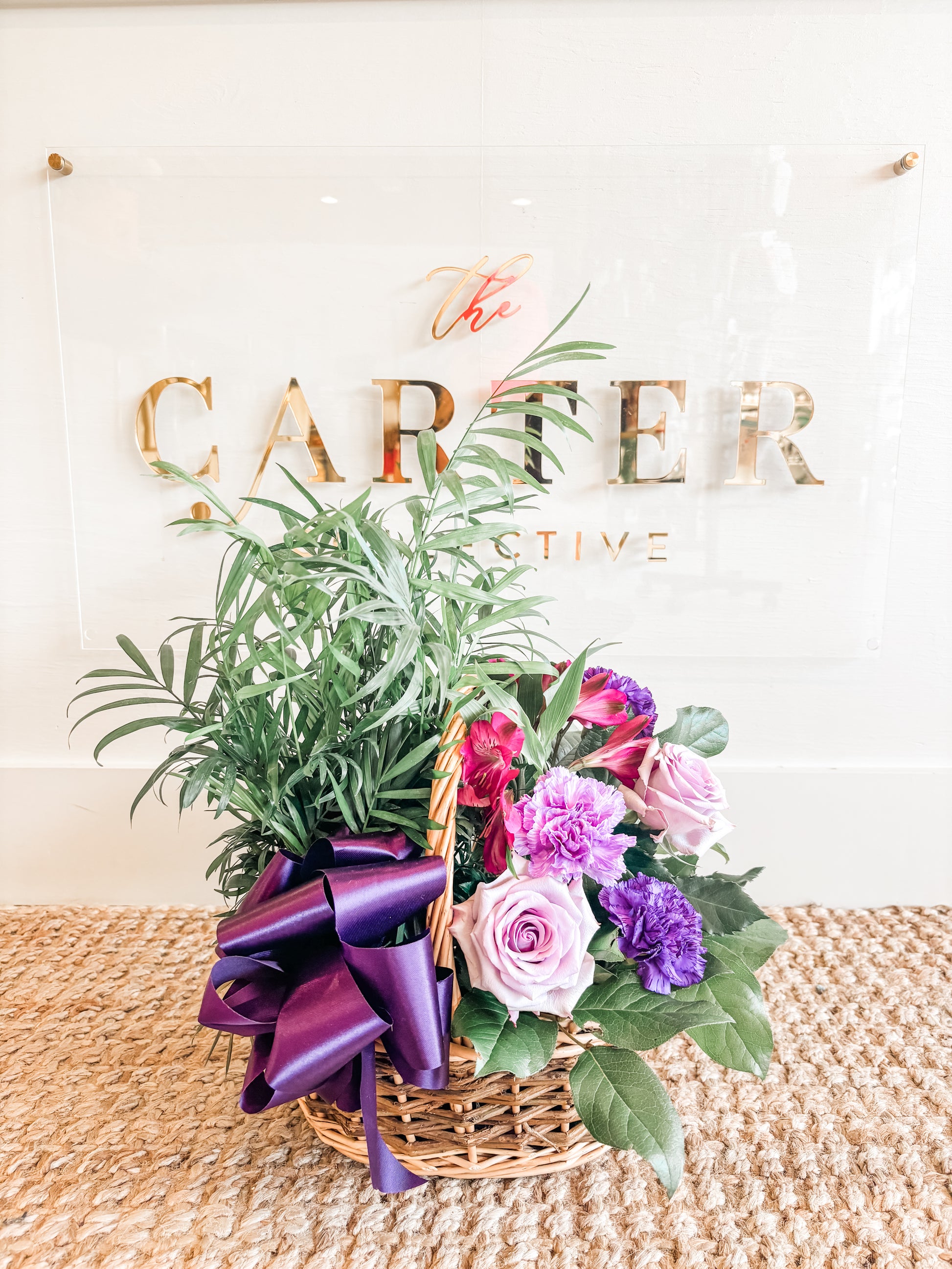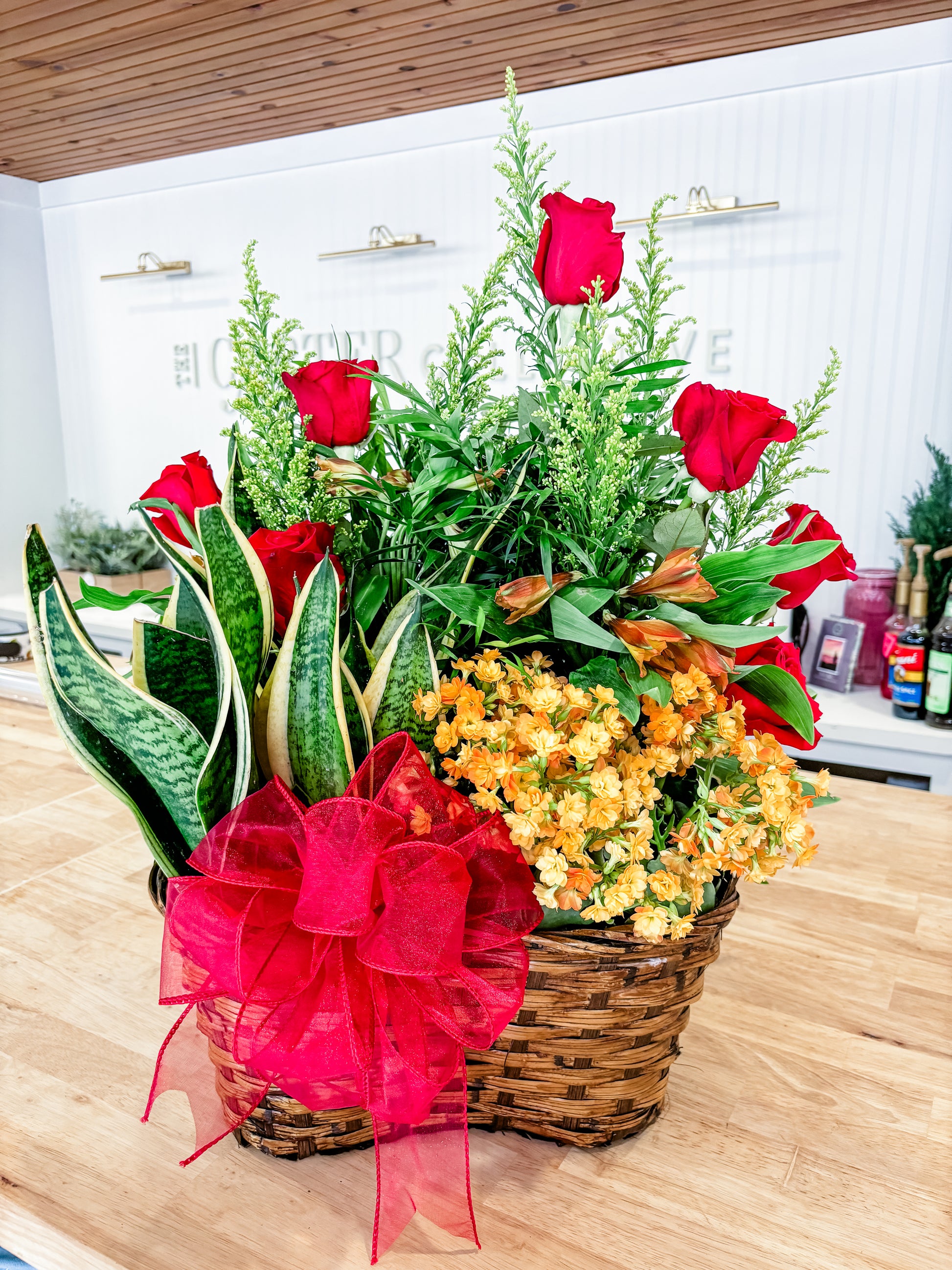 Can't decide between a fresh arrangement and live plants? No problem! This interesting take on the combination will give your recipient best of both. Choose from a 2 or 3 hole basket. Add just a little or lush fresh florals between the live plants. Adorned with a silk ribbon. (Plants are various in sizes and price ranges, designer will take your budget and create within that range)